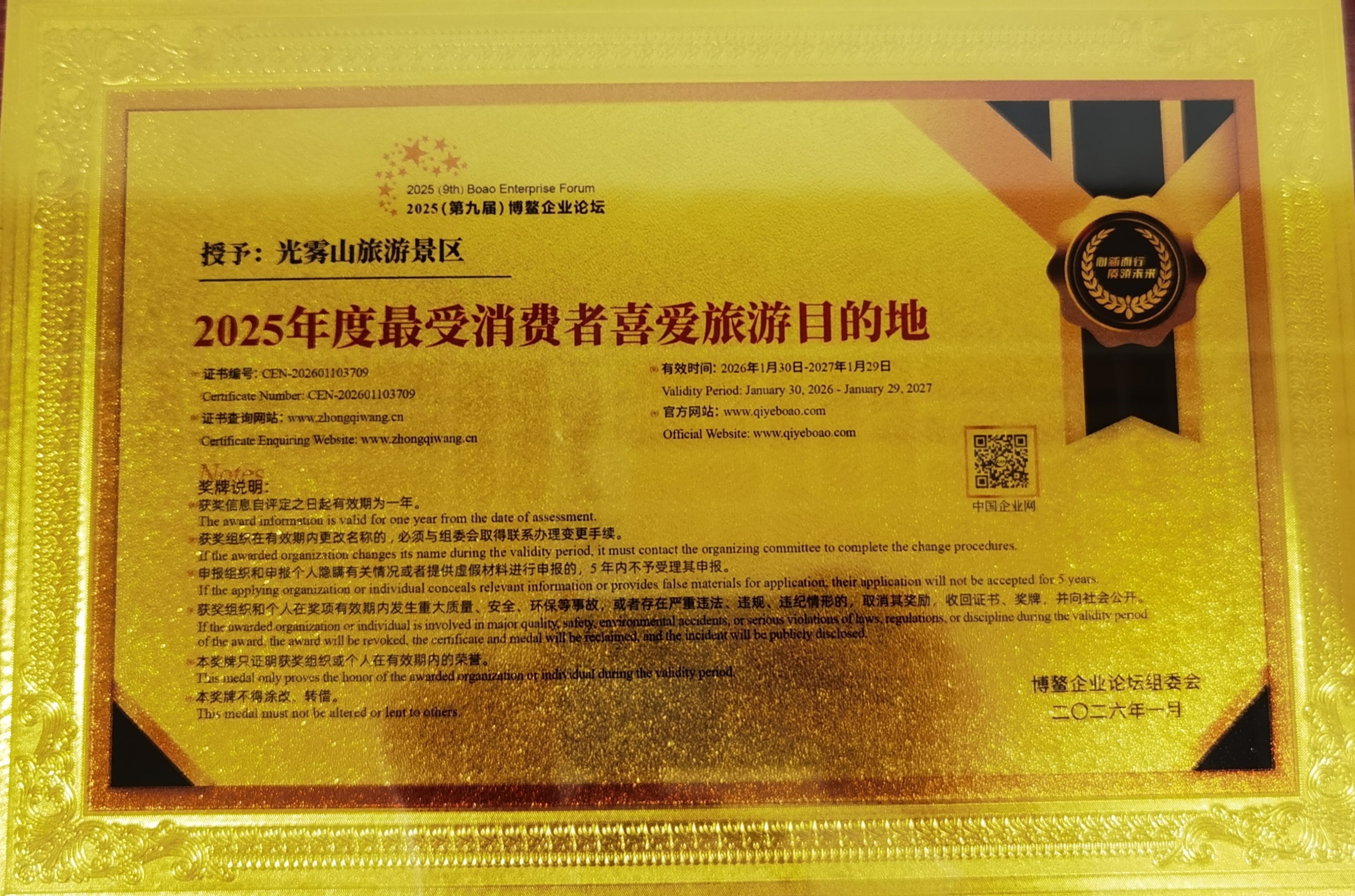 光雾山景区获评“2025年度最受消费者喜爱旅游目的地”称号