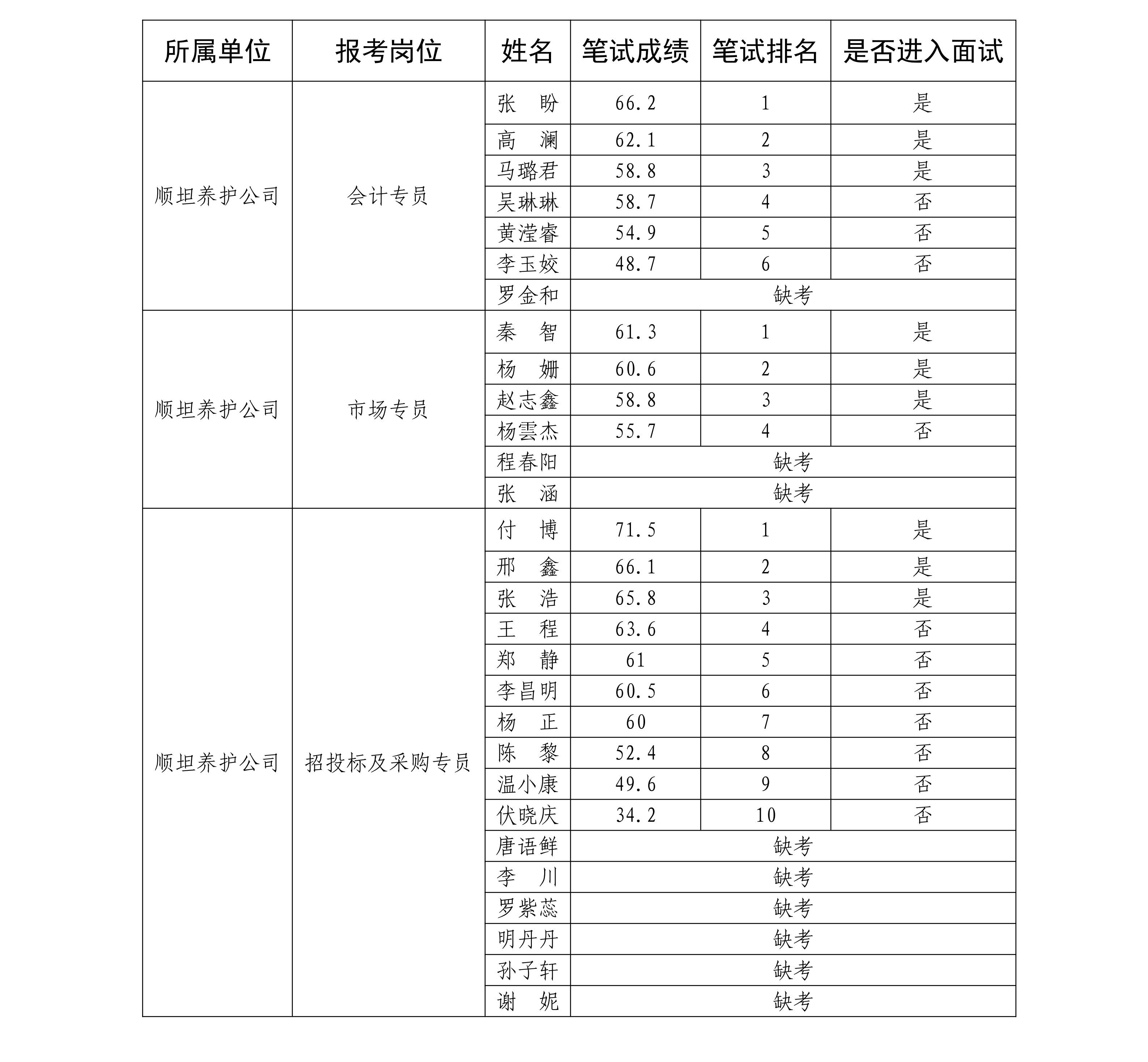 根据招聘公告规定,按照笔试成绩从高到低的顺序,以岗位招聘人数1:3的比例确定进入面试人选,笔试参考人数未达到3人的职位,该职位符合条件的笔试人员全部进入面试环节。面试时间、地点及相关要求另行通知,请考生保持通讯畅通。