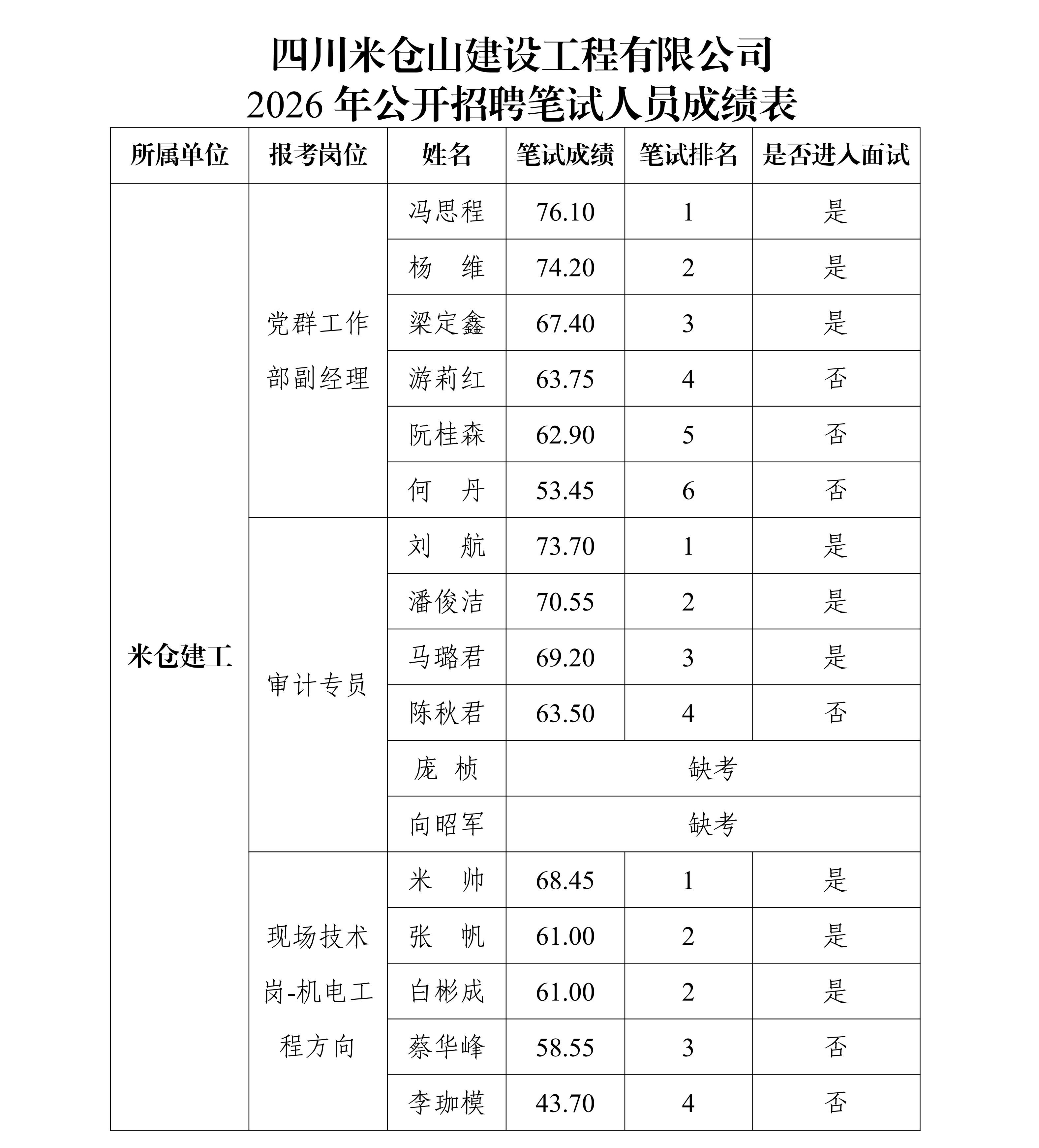 详见附件《四川米仓山建设工程有限公司2026年度公开招聘笔试成绩表》。