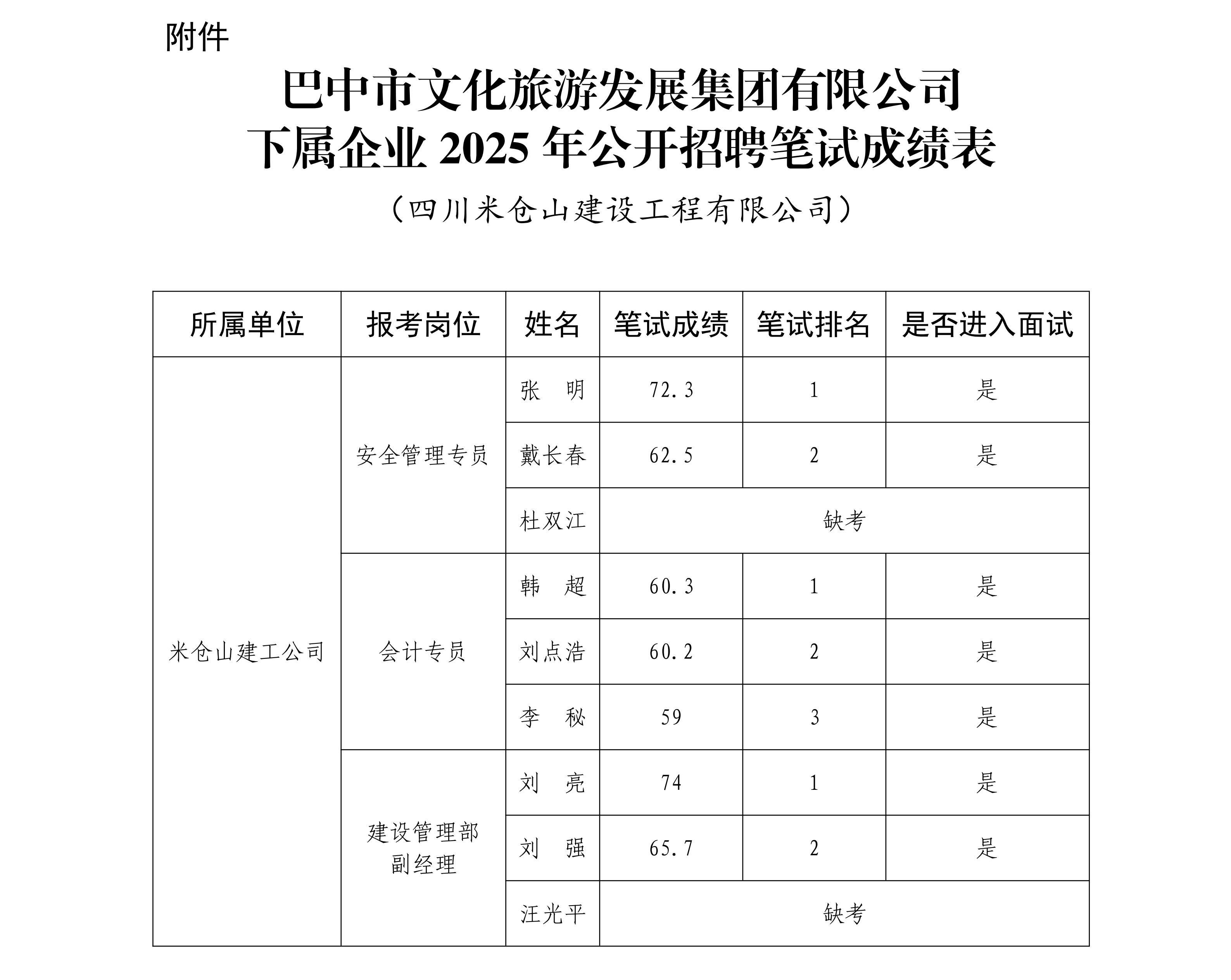 附件:巴中市文化旅游发展集团有限公司下属企业2025年公开招聘笔试成绩表