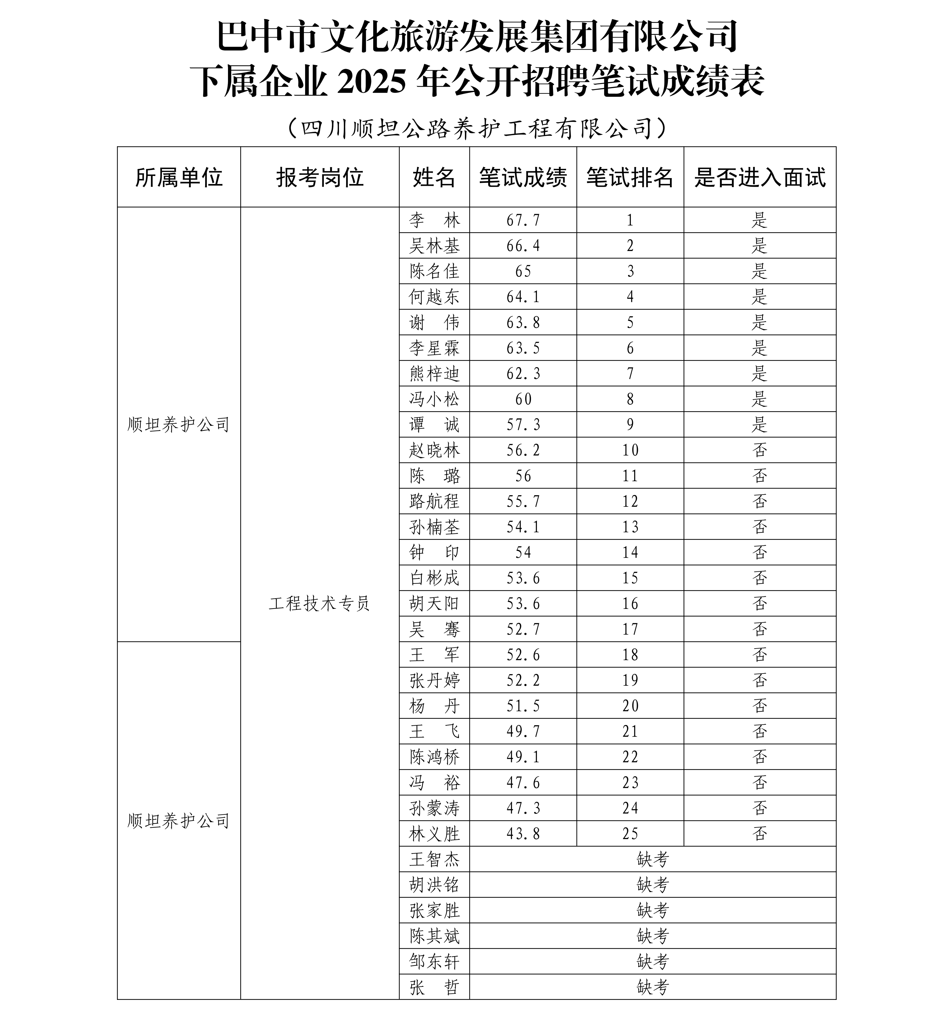 根据《巴中市文化旅游发展集团有限公司下属企业2025年公开招聘公告》相关精神,现将市文旅集团下属企业2025年公开招聘笔试成绩及有关事项公示如下: